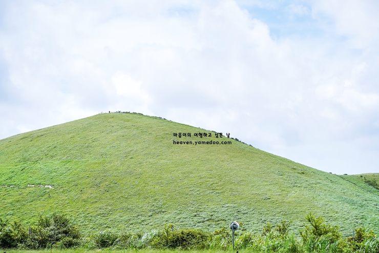 여름철 제주도의 맑고 파란 하늘 아래에서 새별오름에 오르면 제주도의 전경이 한눈에 들어옵니다. 주변의 다른 오름들과 멀리 바다까지 조망할 수 있어 특히 인상적입니다.