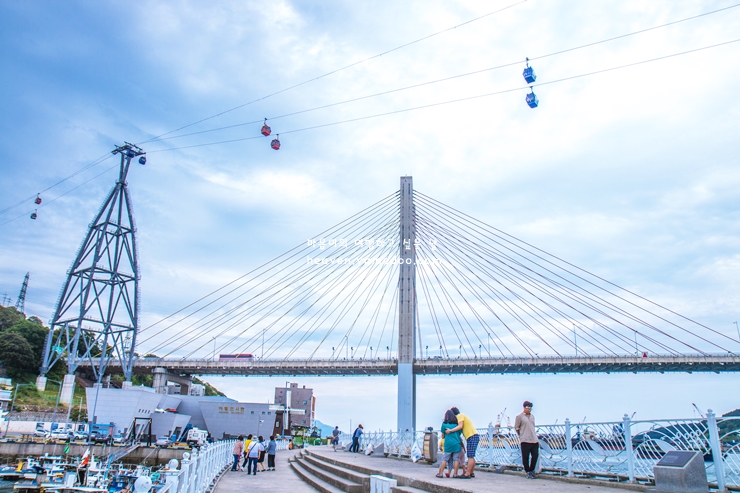 케이블카를 타고 이동하면서 돌산대교를 내려다볼 수 있습니다. 돌산대교는 밤에 조명이 켜지면 더욱 아름답게 빛나는 명소로 유명합니다.