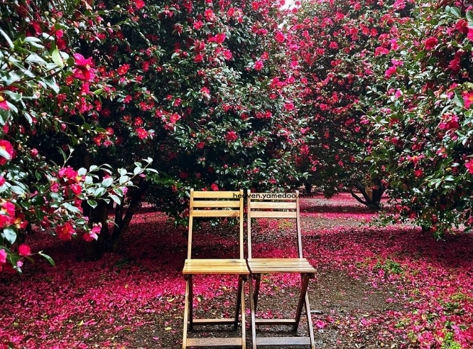 곳곳에 배치된 나무 벤치와 테이블은 잠시 쉬어가며 이 풍경을 온전히 누릴 수 있는 쉼터가 됩니다. 산책로 끝자락에서는 너른 정원이 펼쳐지는데, 이곳은 동백나무 아래에서 사진을 찍기에 최적의 장소로 느껴졌습니다.