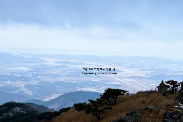 하늘을 올려다보니 맑고 투명한 푸른색이 겨울 산과 어우러져 한 폭의 그림 같았습니다. 정상에 도착하면 탁 트인 풍경이 펼쳐지는데, 저 멀리 서해 바다까지 한눈에 들어왔습니다.