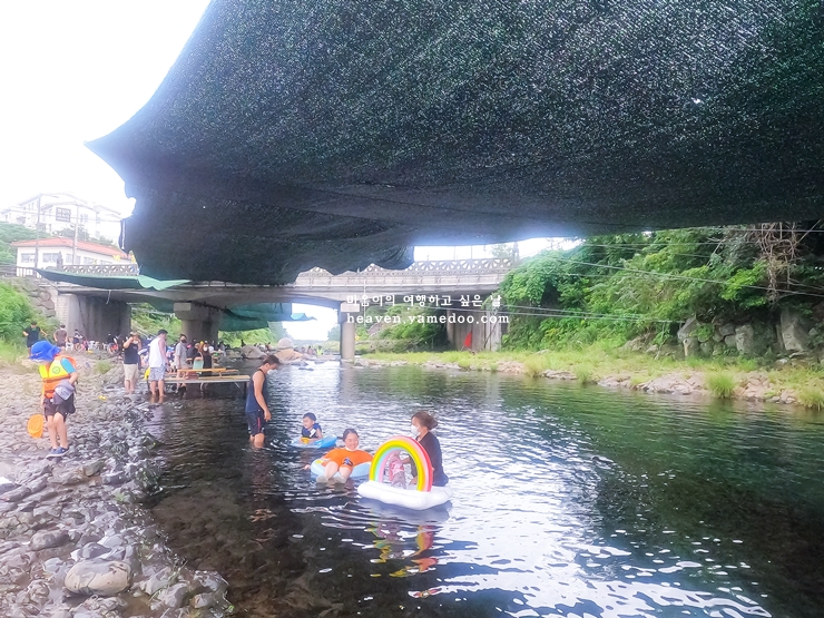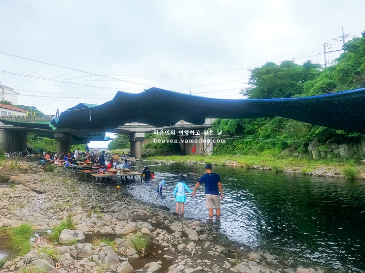 물이 맑아서 은어들이 서식하고 있는 곳 여름시즌이 시작되면 이렇게 평상에 앉아서 백숙을 먹으면서 물놀이를 할 수 있는 8월 제주가볼만한곳 10곳 으로 변모합니다.