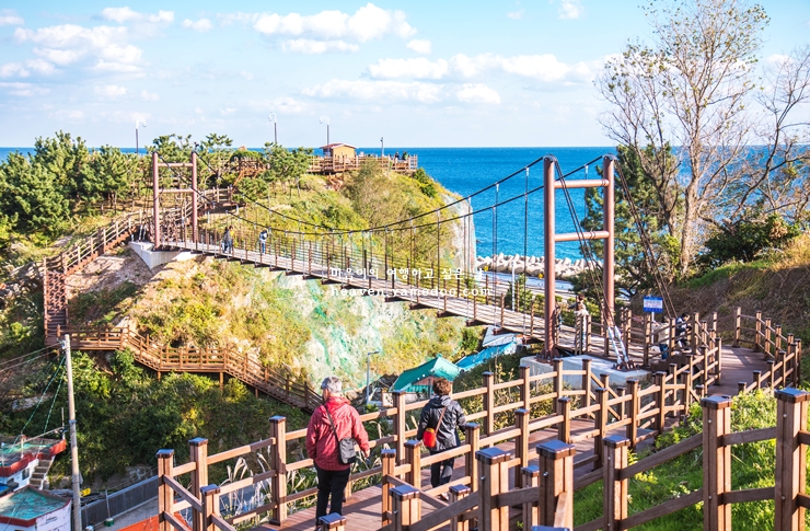 강풍이 불거나 비가 많이 오면 출입이 불가능하며 푸른바다와 함께 풍경을 엿볼 수 있어 울진 최고의 여행코스로 각광을 받고 있습니다. 강화유리 구간이 57미터로 내내 심장이 아찔하면서 마치 바다위를 걷는듯한 착각을 불러오게 합니다.